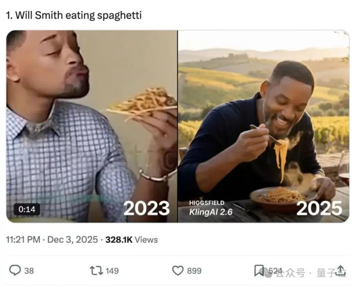 △X网友Min Choi发布的文章,对比了不同技术能力之下“威尔·史密斯吃意大利面”的经典场景