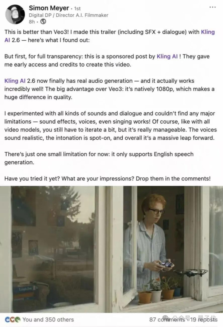 可灵AI海外超级创作者、AI电影导演Simon Meyer制作的这支宣传片,生动诠释了这次可灵2.6的能力创新之处。
