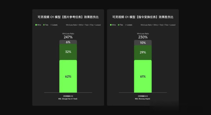 根据可灵AI团队的内部测评,在“图片参考”任务上,可灵AI对Google Veo 3.1的整体效果胜负比为247%;在“指令变换”任务上,与Runway Aleph对比的整体效果胜负比达到230%。